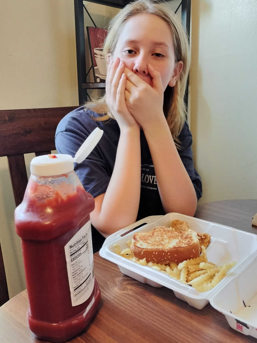 There were maybe seven people in the entire restaurant—which is a packed house, by Riley's standards. She shy-turtled herself into her shirt and asked if we could take our food home to eat.