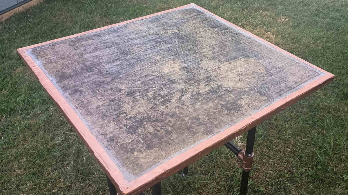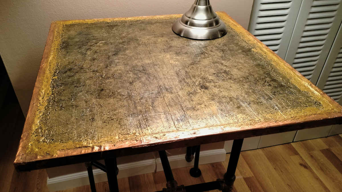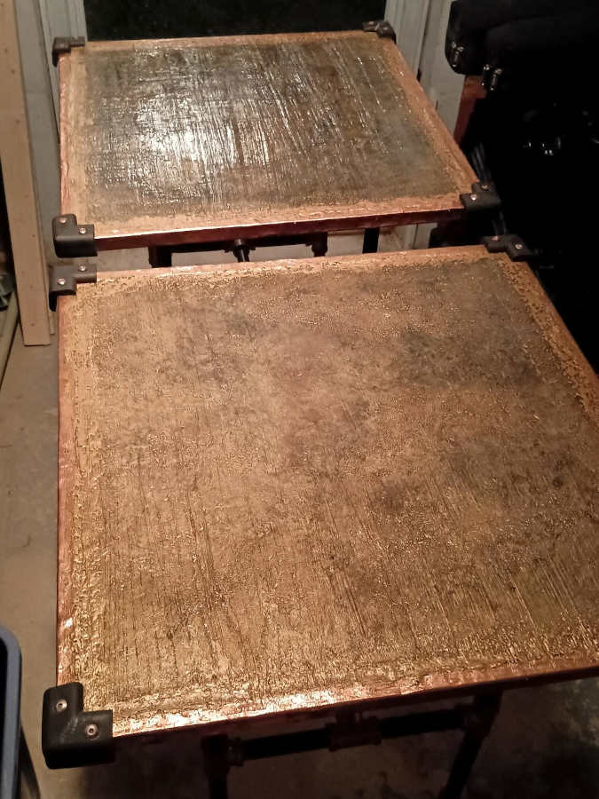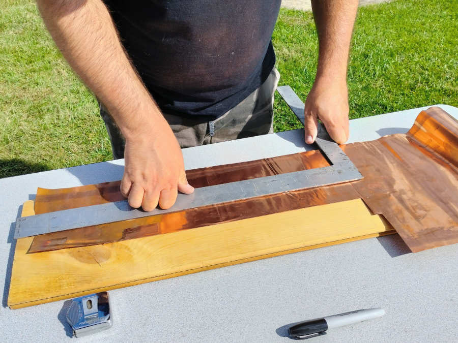 While I applied a clear coat, Joe started cutting pieces of rolled copper that would serve as a trim around the sides of the tabletops...