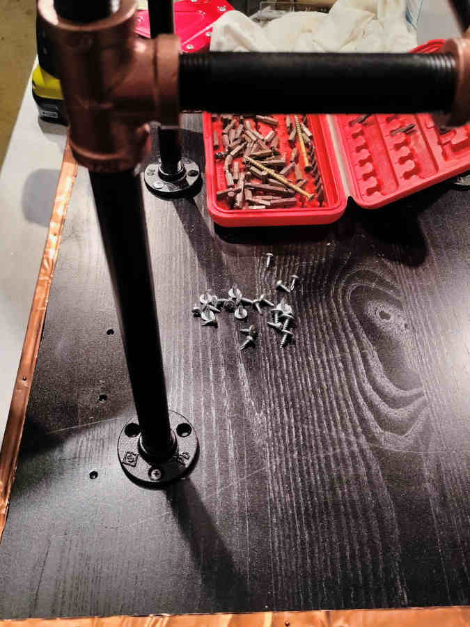 But he didn't like how it looked; so we decided to put that on hold for the time being, and we anchored the tabletops to the legs first instead...