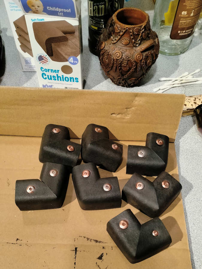 Meanwhile, Joe had found some foam corner guards that would let us deal with the sharp copper edges that were still on the outside corners of the tabletops...