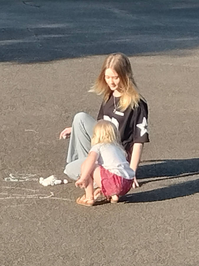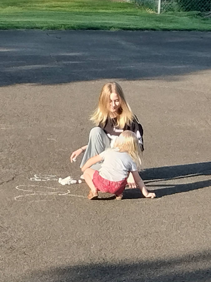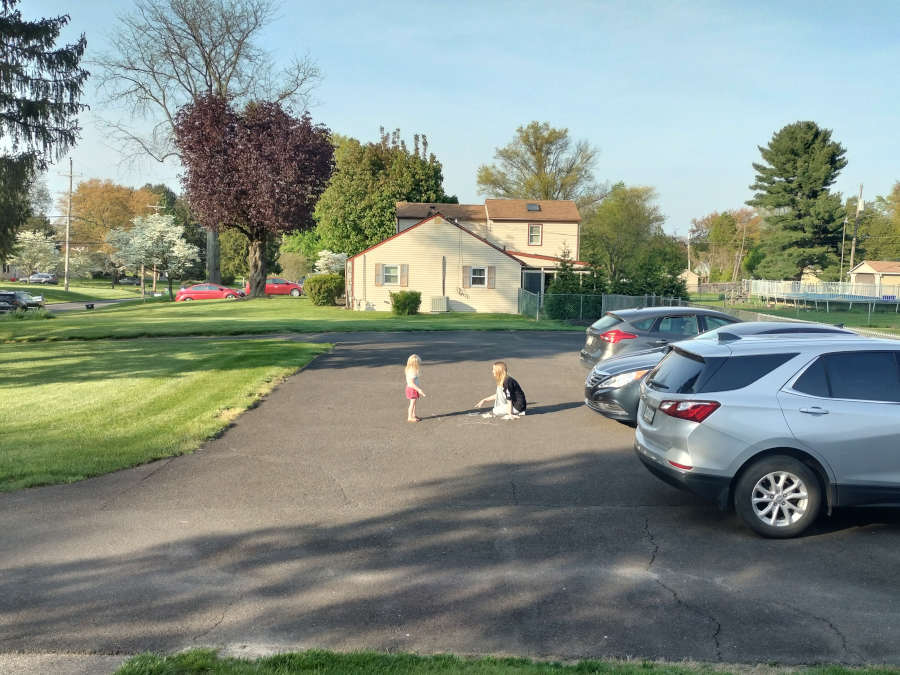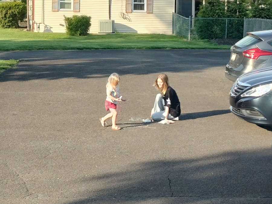 On Sunday, we got invited over to my parents' house. We ordered from Taormina's for dinner, and then Liv asked her cool cousin Riley to come outside and do sidewalk chalk and play soccer with her...