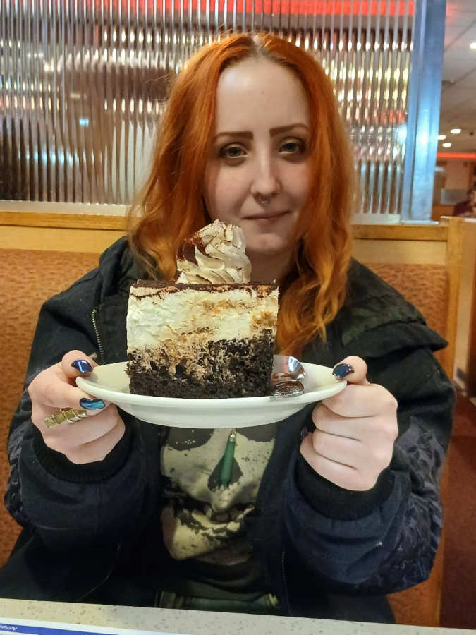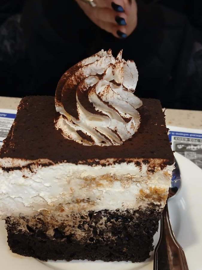 Taylor got a piece of tiramisu the size of a cinder block!