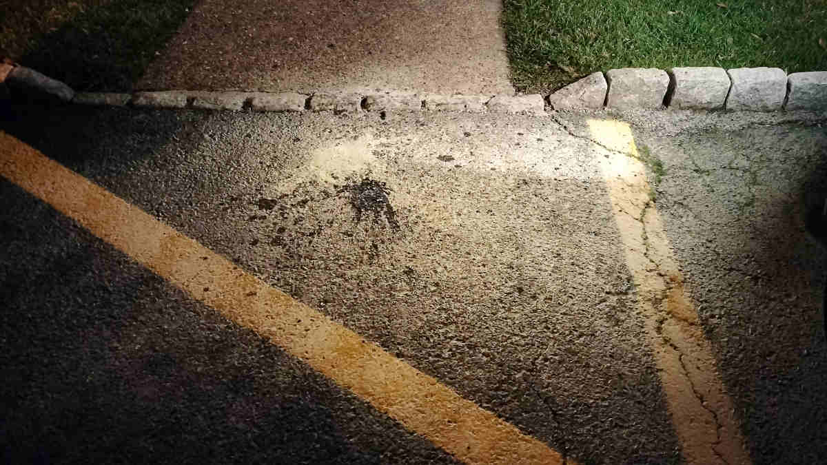 The glow from still-flaming grease on the asphalt