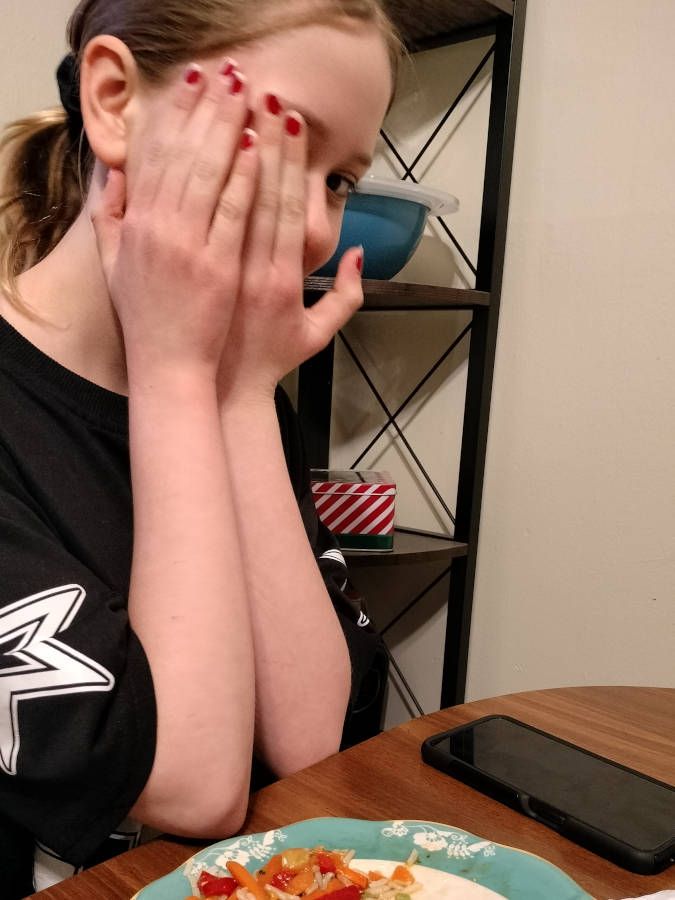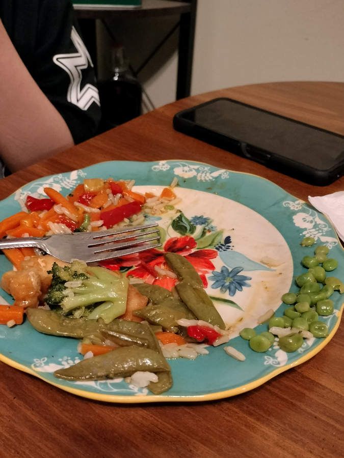 Considerably more interesting than the eclipse was the incident at the dinner table that evening, when I realized that the molerat had for some reason extracted all her peas from their pods and lined them up at the edge of her plate—all while eating virtually nothing but the chicken.