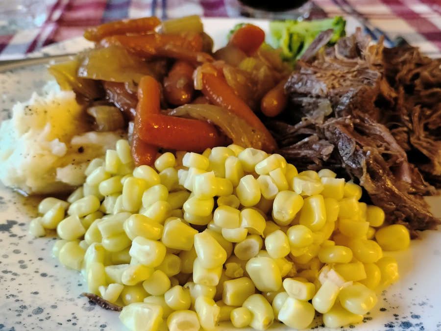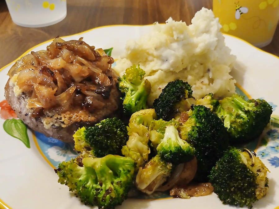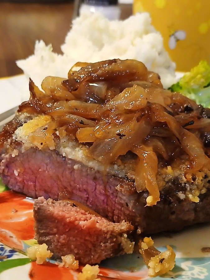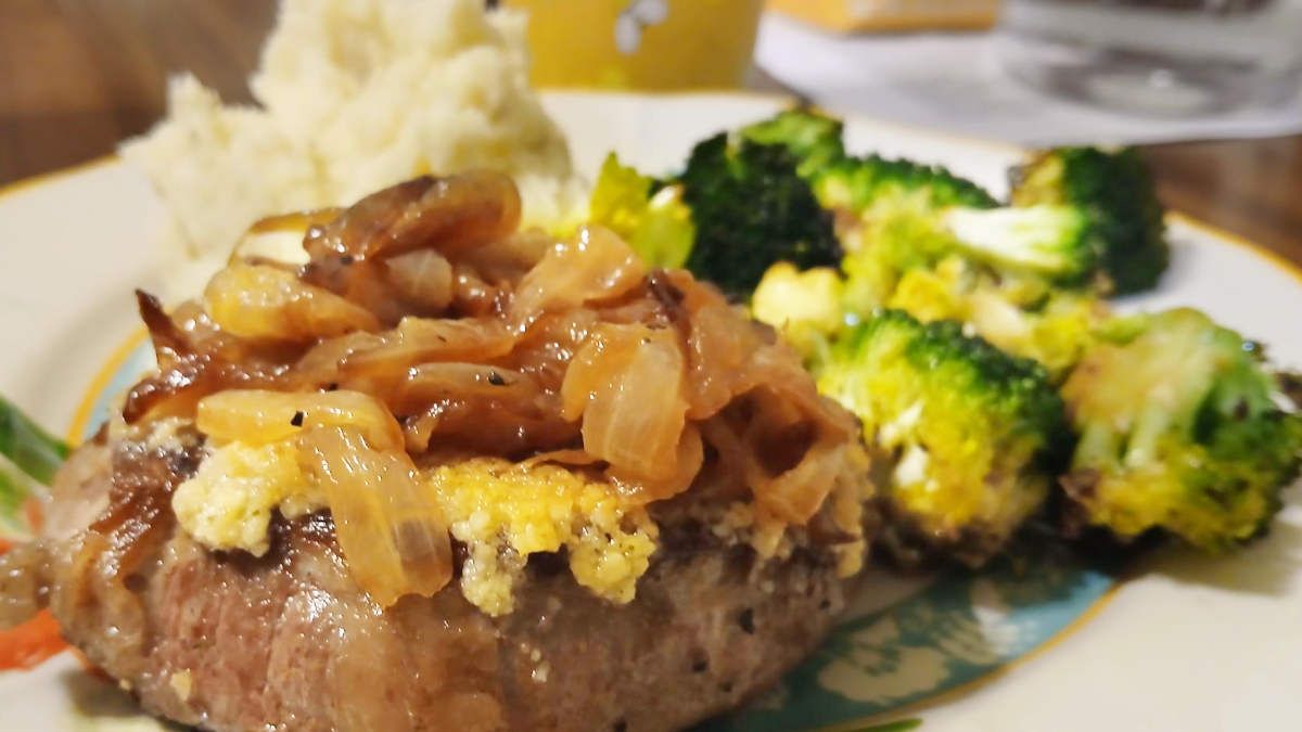 But, she made steak two evenings later—with broccoli, mashed potatoes, and caramelized onions on top of a Parmesan crust...