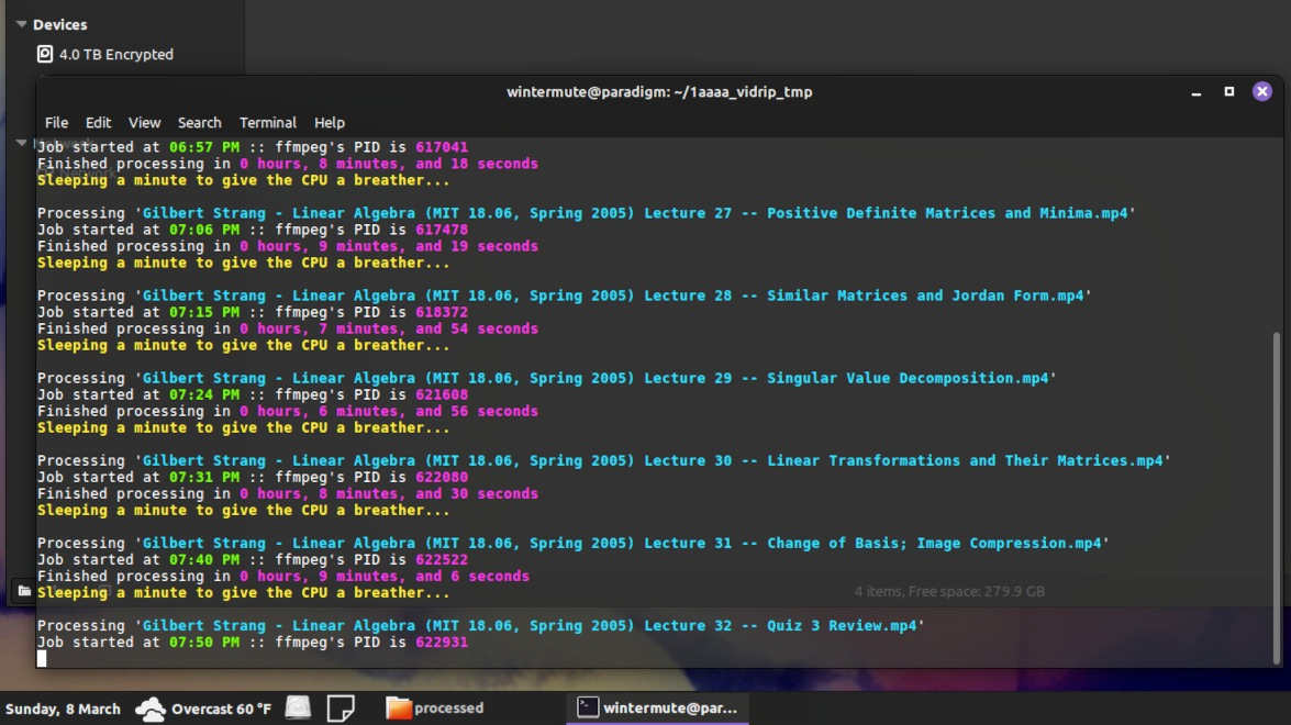 Midway through last month, I coded a quick and dirty shell script to get a better handle on things: ffmpeg doesn't have any kind of "pause" functionality built into it; so, instead, I just had my script keep a few timers going, and I'd periodically tell the operating system to temporarily stop ffmpeg's execution so that the CPU could take a breather and let some of the excess heat dissipate.