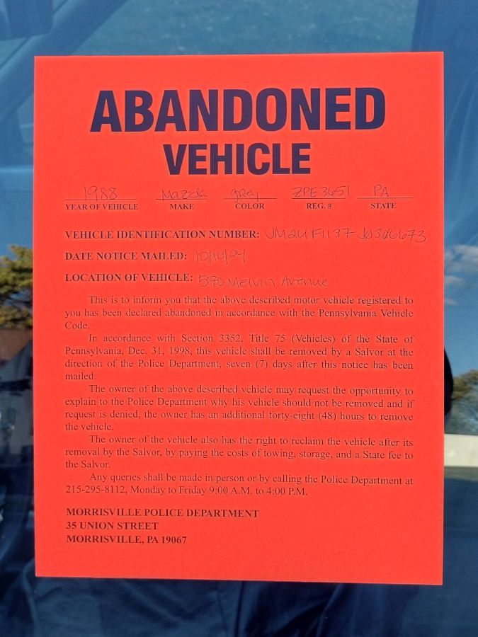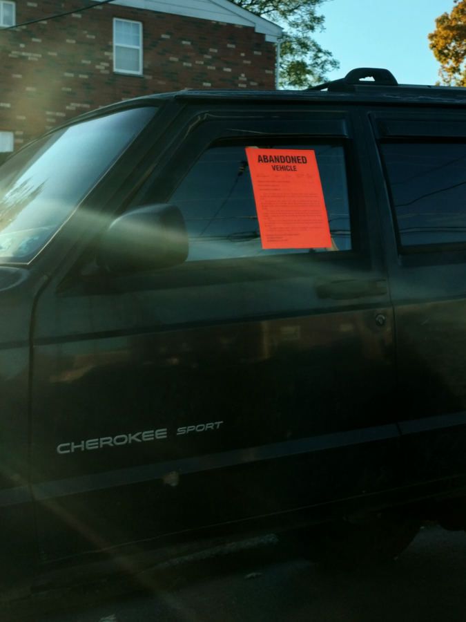 A day I've been eagerly awaiting forever finally arrived this past Monday: I happened to look out our bedroom window and say that Cherkoff's crappy truck has at long last been tagged with a neon orange "We'll Be Impounding This Shit-Heap in Exactly One Week's Time" sticker...