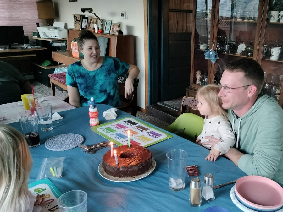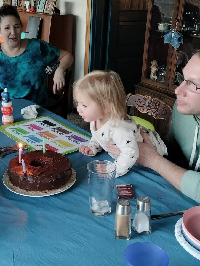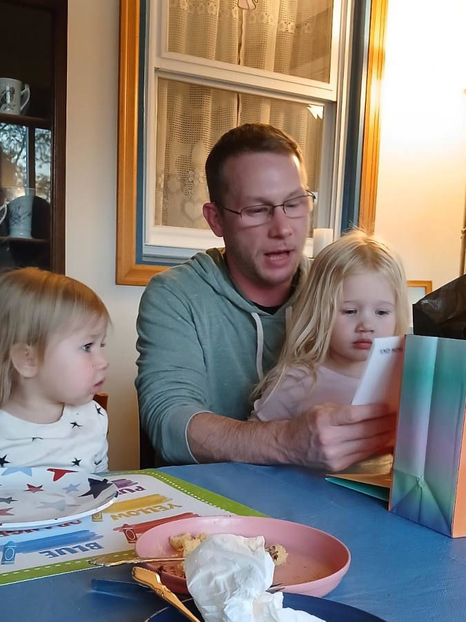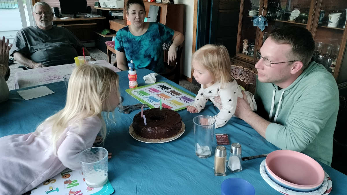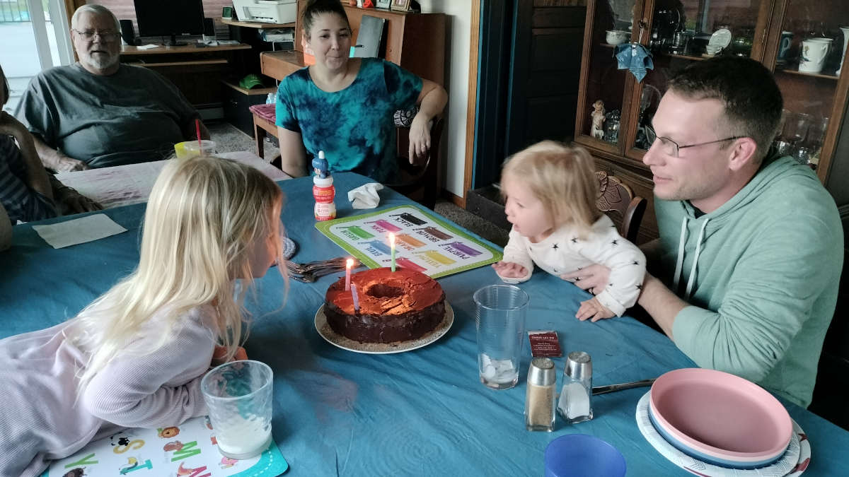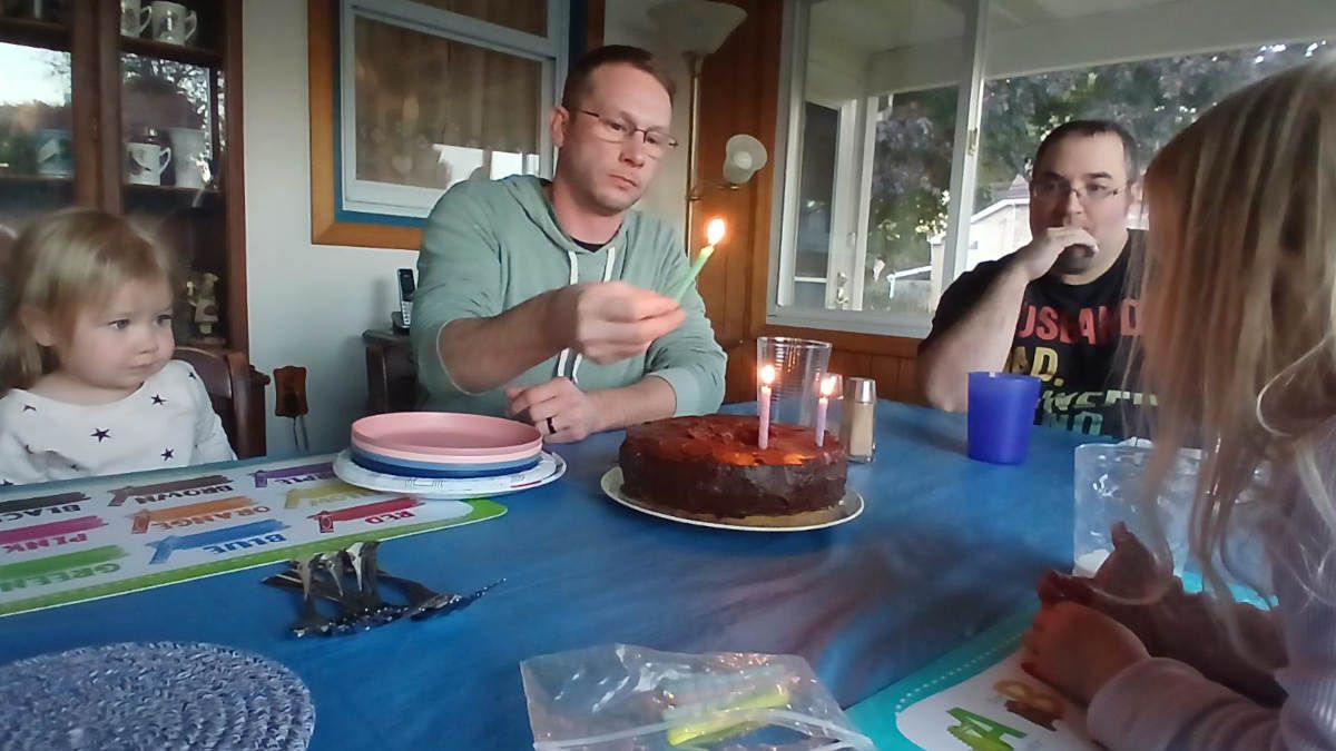 ...with candles that Steve's too old to blow out on his own now; so the girls helped...