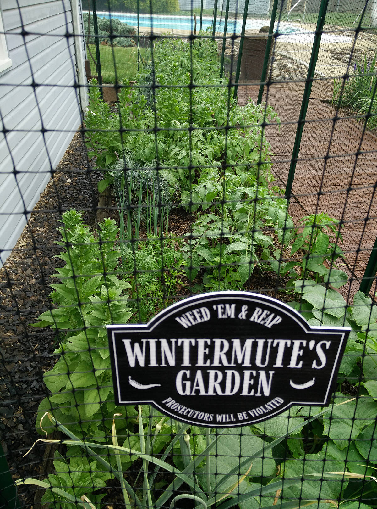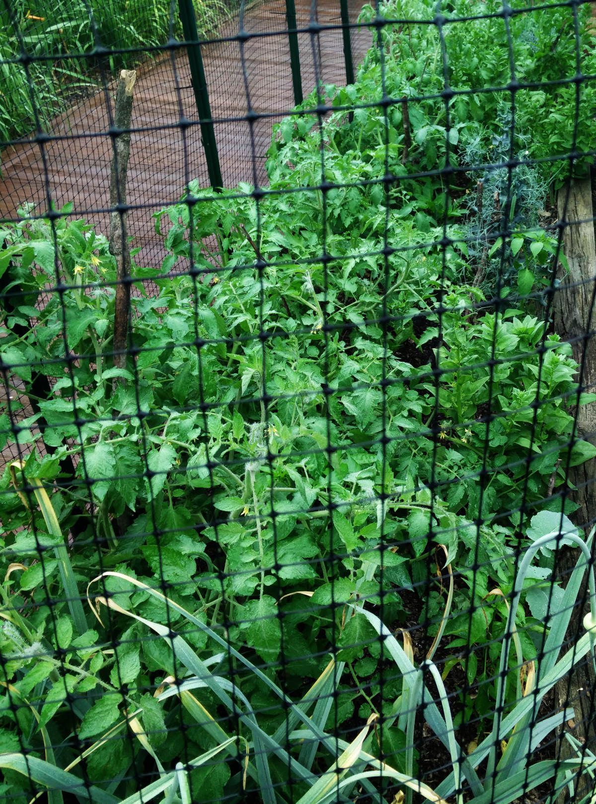 From front to back in the above picture, we have garlic, cucumbers, spinach, basil, carrots, Vietnamese coriander, tomatoes, peppers, scallions, snap peas, cilantro, and broccoli. (Mint is in its own pot over on the deck: It'll take over the entire bed if you plant it in the ground.)