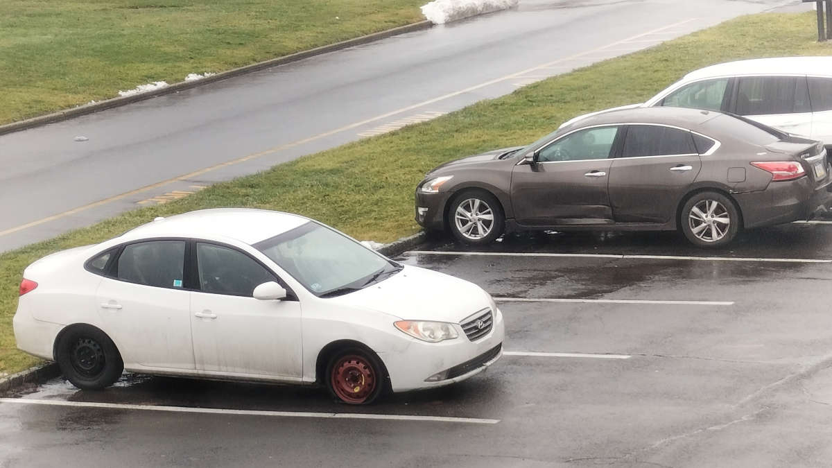 Thursday Kevin sent me this picture while he was waiting for his mom to stop by. This is "Speed Demon's" car, the same one that had a flat tire just a few months back when we were heading out to celebrate Olivia and Hannah's birthdays. (And the car in the background belongs to the downstairs neighbors and hasn't moved since the week of Christmas, so we've been considering anonymously complaining to the landlord in the hopes of having it towed.)