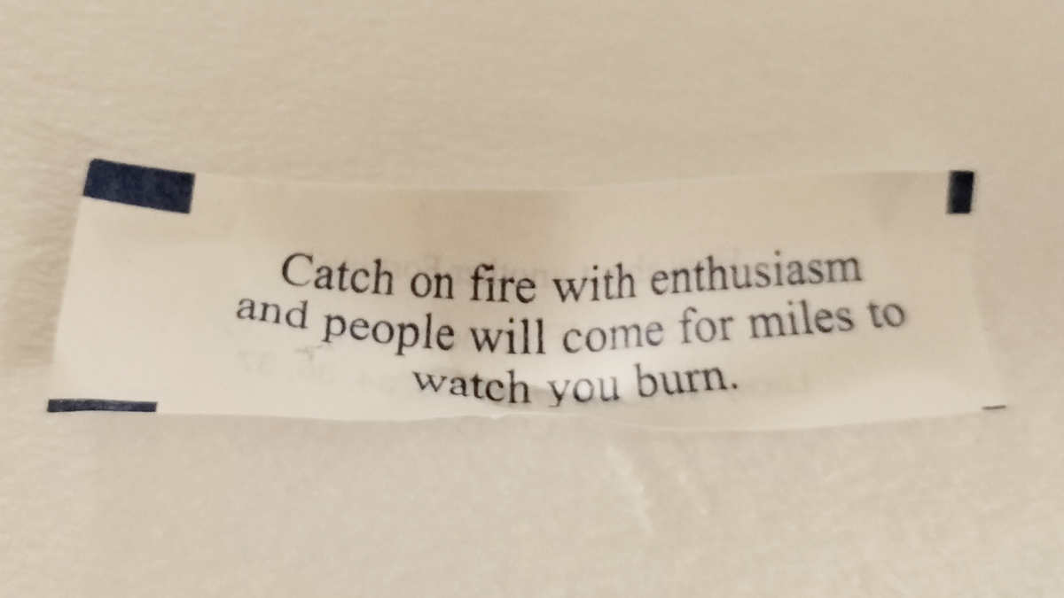 We knew Riley's fortune would be especially noteworthy, since this was her birthday celebration—and everyone knows our universe operates in a completely deterministic fashion, such that some minimum-waged drone in a cookie factory six months ago could've foreseen Riley's future and then rigged the order of the shipments in such a way that he could ensure she would receive the correct fortune all these weeks later...