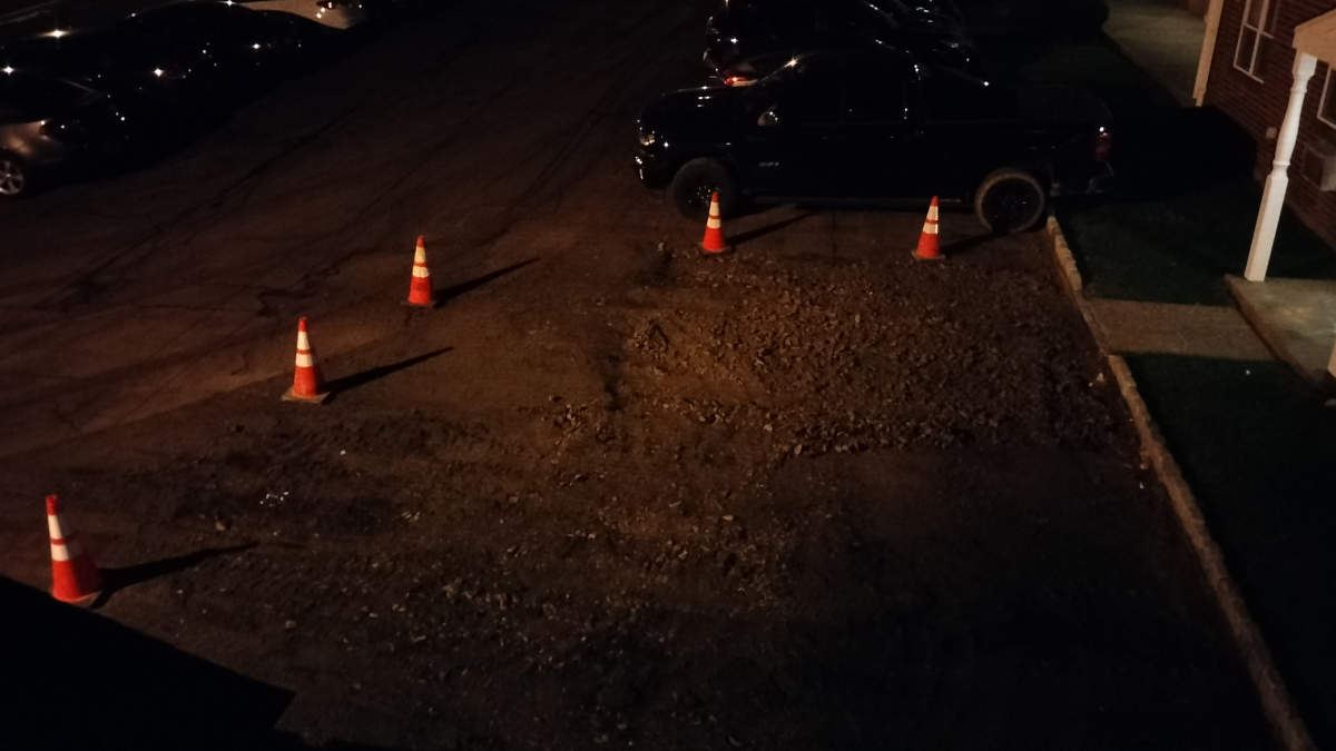 We chatted for five minutes or so, and he explained that the places where they'd dug down deeper were just soft spots they found while shaving off the top two inches of asphalt. (The soft spots just happened to coincide with the corners and the handicapped spots in our parking lot, I guess.)