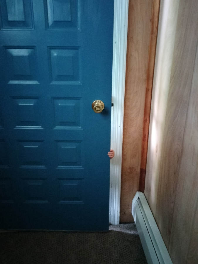 At one point Hannah almost managed to completely two-dimensionalize herself between the front door and the screen door so it looked like that famous scene from The Shining...