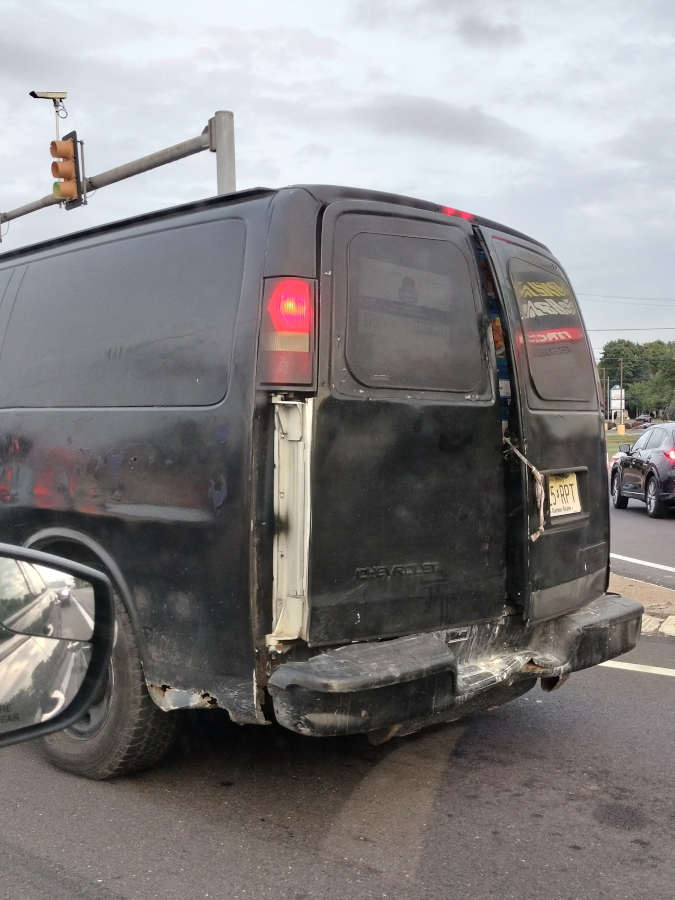 The rusted frame? The manual spray-paint job? The fact that the doors won't even close? The human tibia hanging out the back? The three or four kidnapped schoolgirls you have to assume are inside?