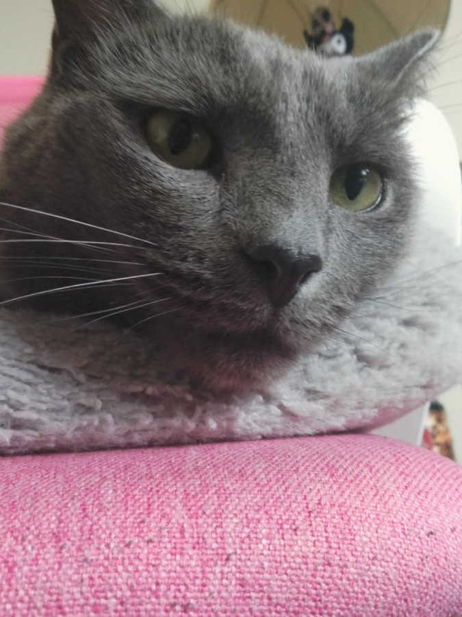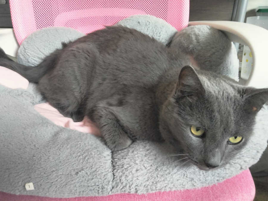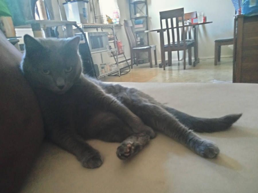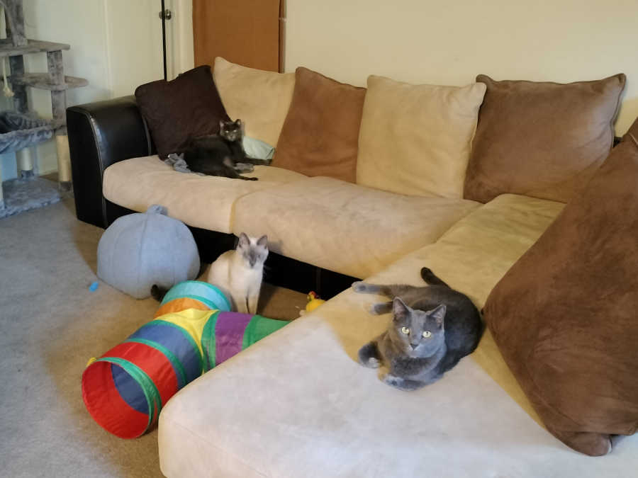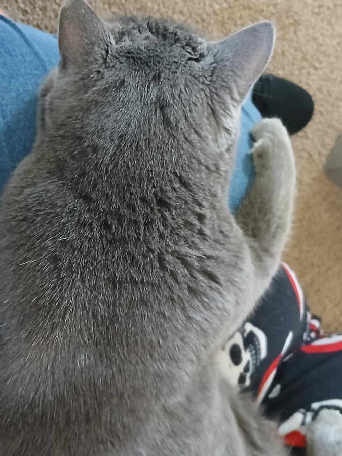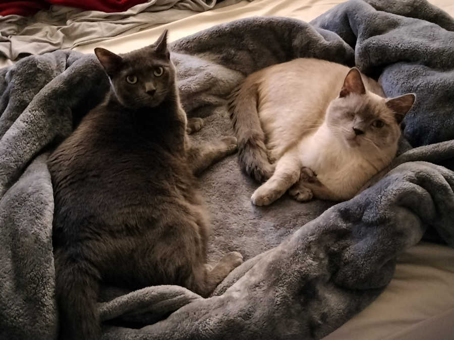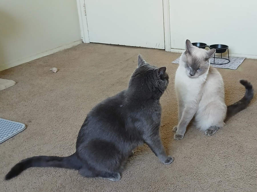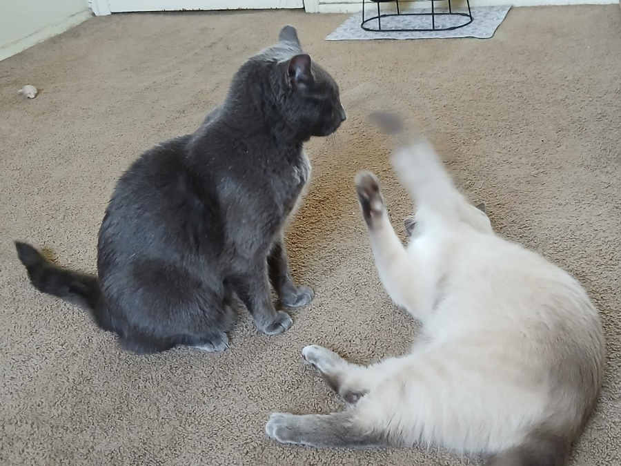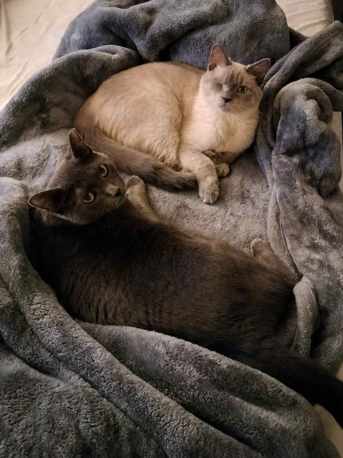 ...And finally, some Russian blue matryoshki: Lucky sitting on Riley's lap, while Riley sits on Athennia's lap...