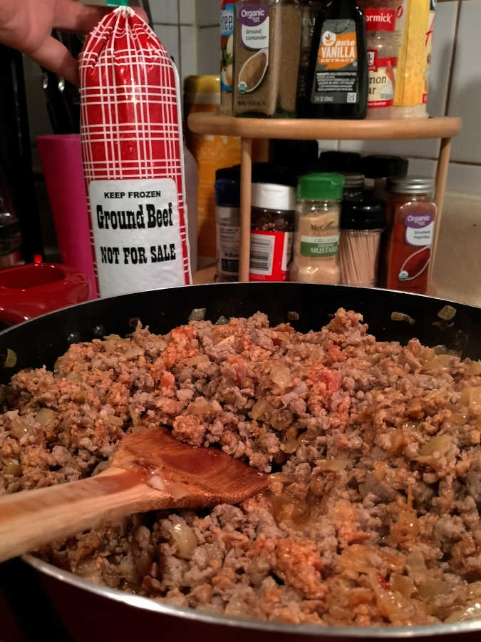 The first order of business was to decide whether or not to use the farm-fresh beef and sausage Aunt Jill and Uncle Terry had given us.