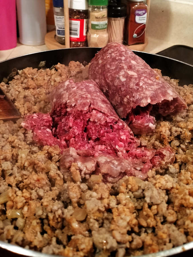 We finally decided to share with everyone else. And as I stood there cooking probably seven pounds of ground beef and sausage, Kevin and I had a field day satirizing the vibrant colorings contrasted with meat from the grocery store: