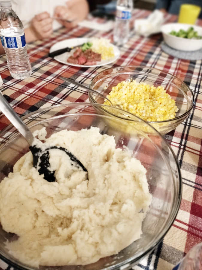 I made mashed potatoes and heated up some corn, Catherine made broccoli, and Ron grilled the steaks: