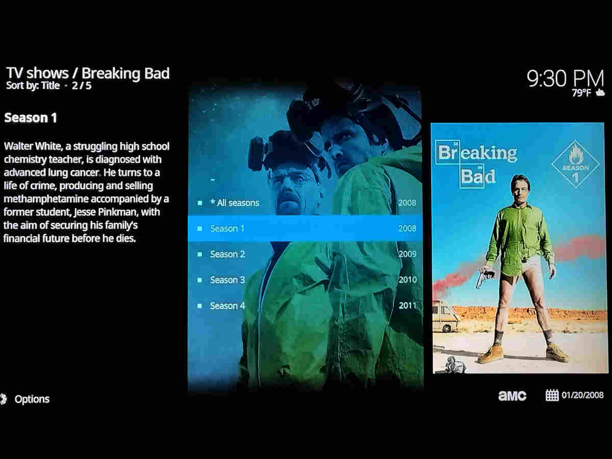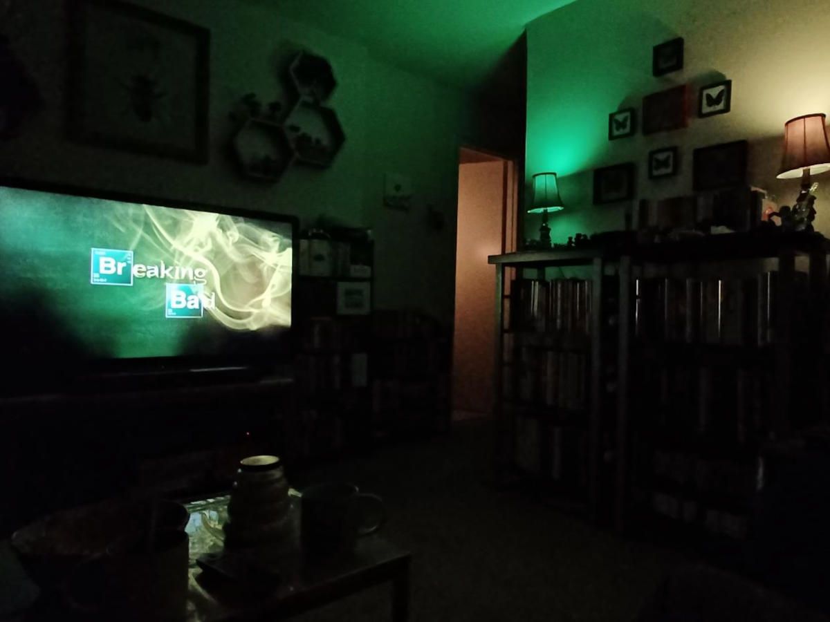So, Riley got cozy by cocooning herself under every stuffed animal on our sofa; then we set the living room lights to Breaking Bad colors, and I fired up the pilot episode on my HTPC...