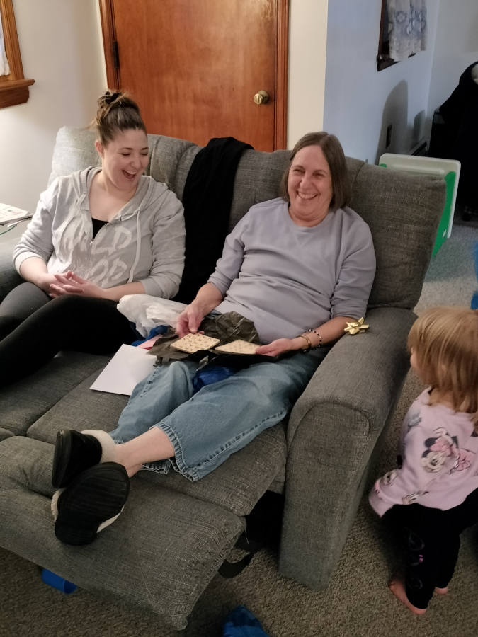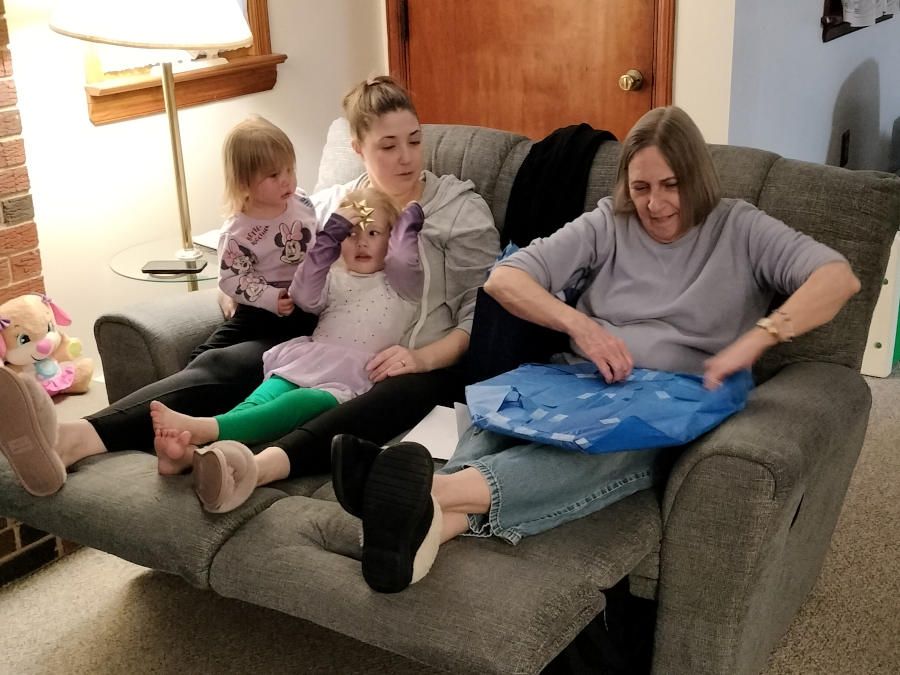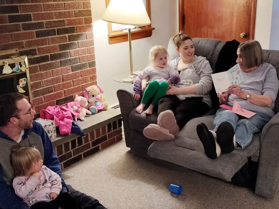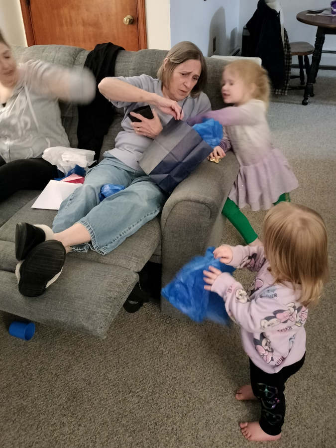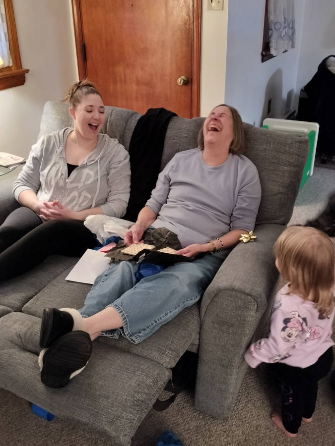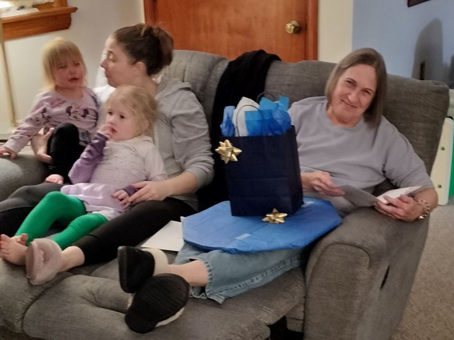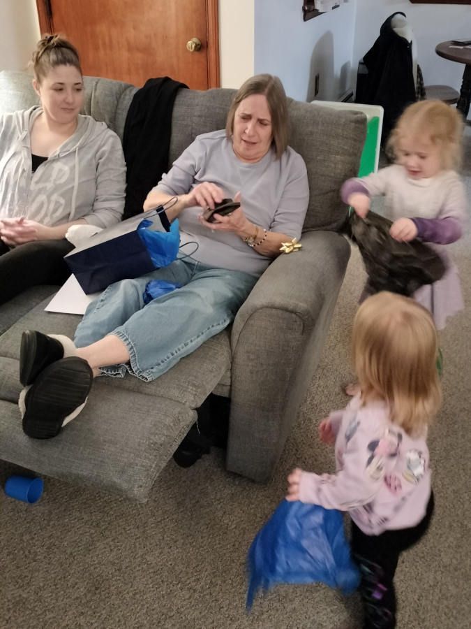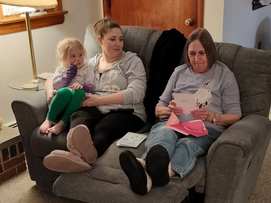 Here's my mom getting hit right in the feels by a birthday card (and also, Liv's brain must've been itchy)...